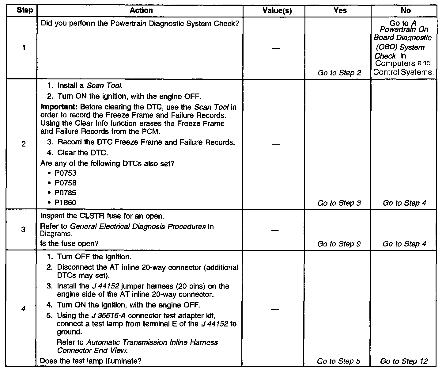 The numbers below refer to the step numbers on the diagnostic table.