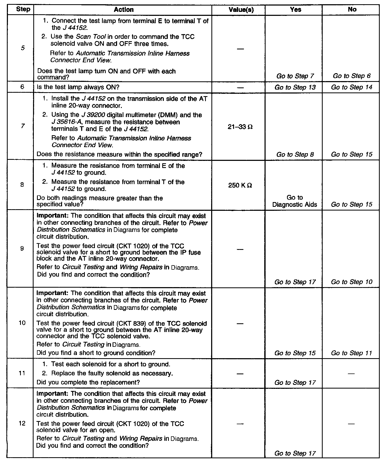7. This step tests the resistance of the TCC solenoid valve and the Automatic Transmission (AT) wiring harness assembly.