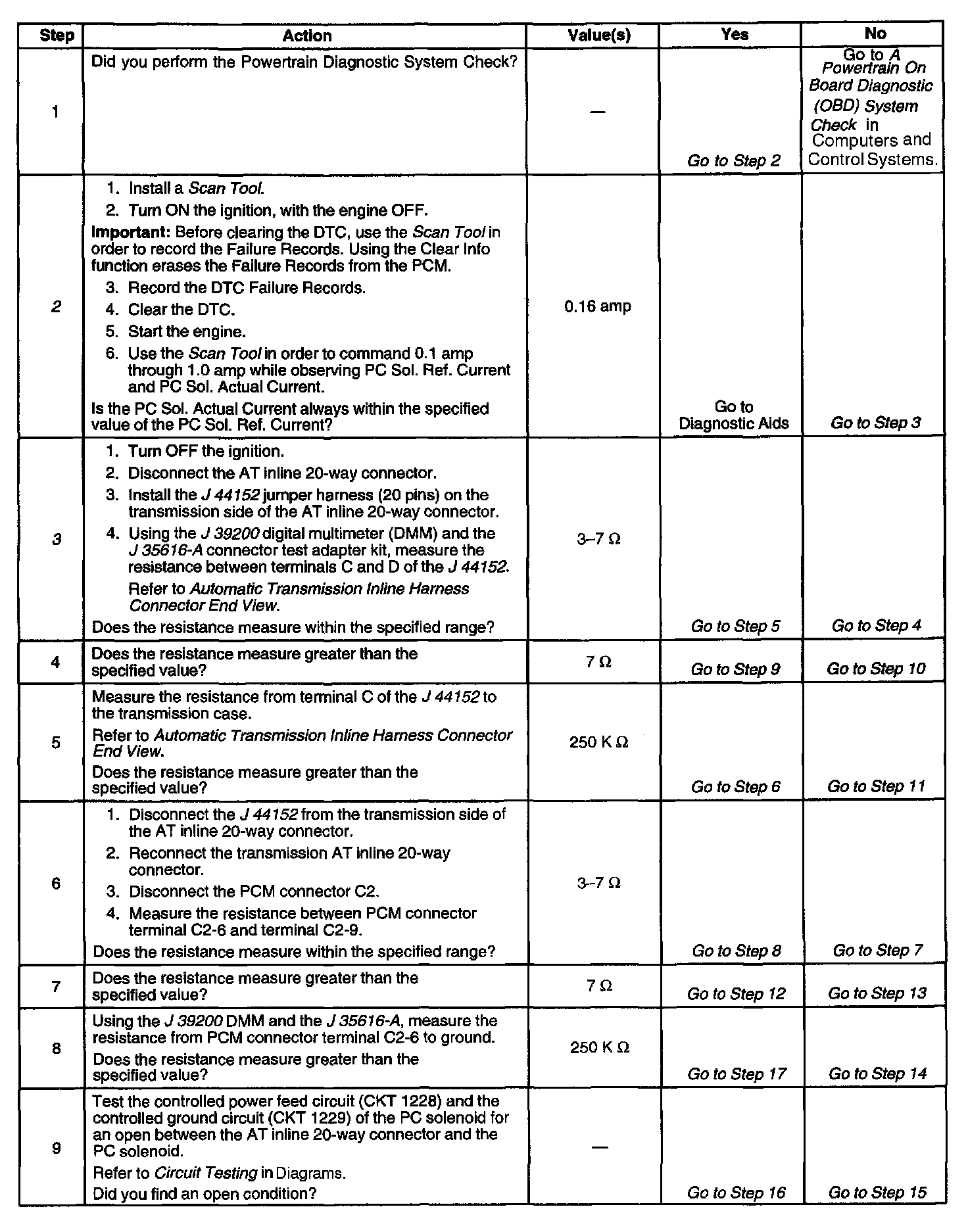 3. This step tests the PC solenoid valve and Automatic Transmission (AT) wiring harness assembly for incorrect resistance.