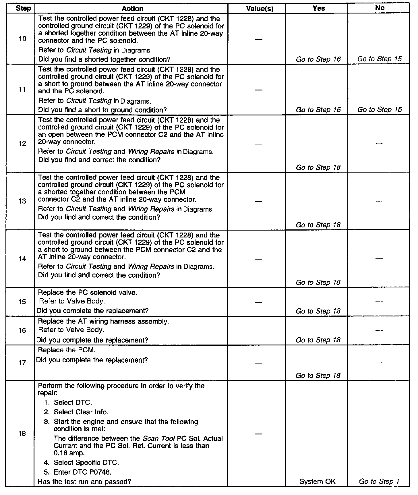 When the PCM detects a continuous open or short in the PC solenoid valve circuit, then DTC P0748 sets. DTC P0748 is a type C DTC.
