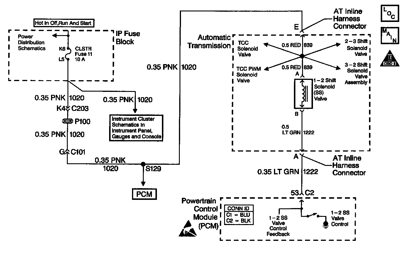 The 1-2 Shift Solenoid (SS) valve controls the fluid flow acting on the 1-2 and 3-4 shift valves. The 1-2 SS valve is a normally-open exhaust valve that is used with the 2-3 SS valve in order to allow four different shifting combinations. The solenoid attaches to the control valve body within the transmission. The 1-2 SS valve receives ignition voltage through circuit 1020. The Powertrain Control Module (PCM) controls the solenoid by providing the ground path on circuit 1222.