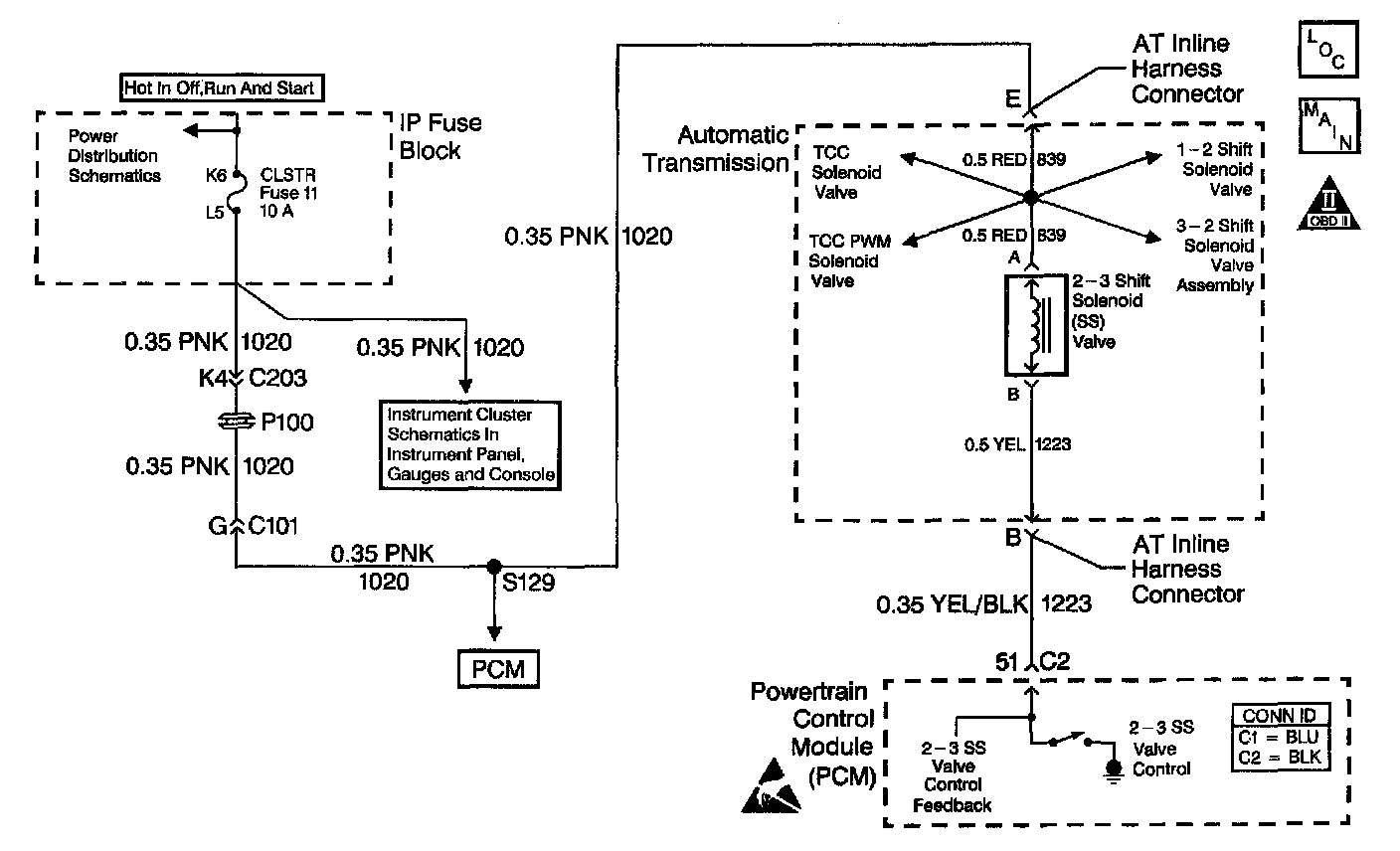 The 2-3 Shift Solenoid (SS) valve controls the fluid flow acting on the 2-3 shift valves. The 2-3 SS valve is a normally-open exhaust valve that is used with the 1-2 SS valve in order to allow four different shifting combinations. The solenoid attaches to the control valve body within the transmission. The 2-3 SS valve receives ignition voltage through circuit 1020. The Powertrain Control Module (PCM) controls the solenoid by providing the ground path on circuit 1223.