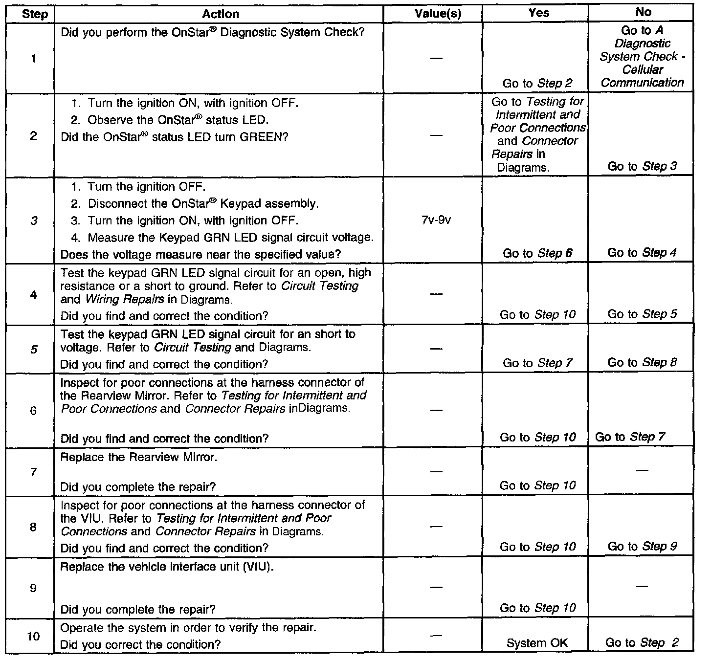 This procedure is for diagnosing problems with the OnStar(R) button assembly. The following numbers refer to the steps in the table.