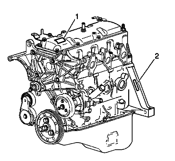 Identification can be made through the use of the Broadcast Code label on the valve rocker arm cover (1) and the use of the partial VIN etched on the left side of the engine block above the starter (2).