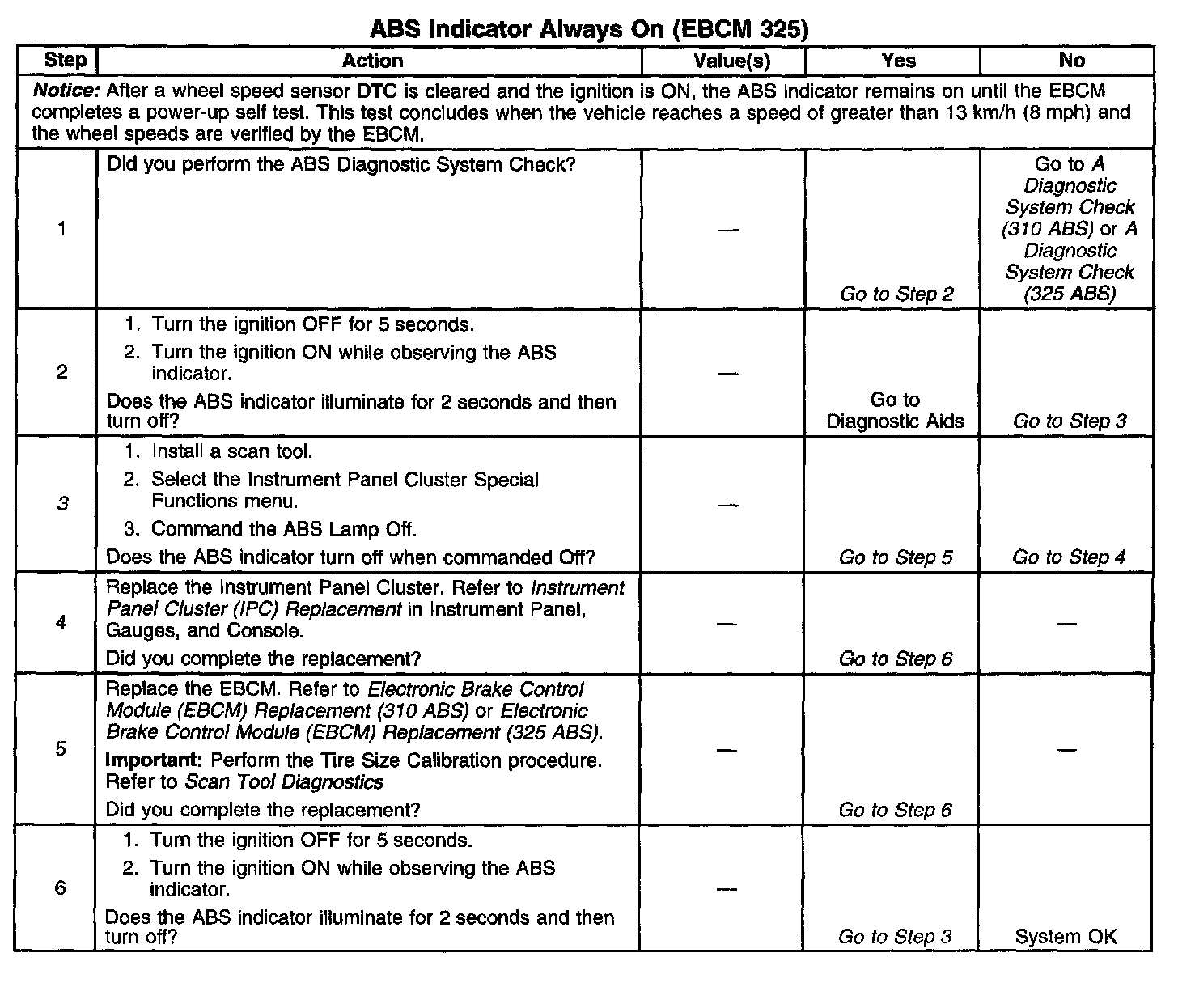 Circuit DescriptionThe Instrument Panel Cluster (IPC) commands the ABS Indicator on at bulb check until the IPC receives a class 2 serial data message from the EBCM commanding the ABS indicator off. If the EBCM sets a DTC(s), the EBCM may send a class 2 serial data message to the IPC commanding the ABS indicator on.