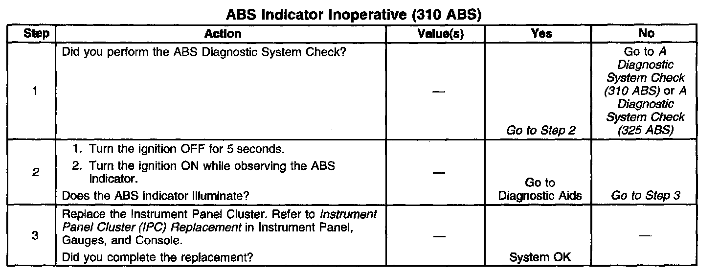 Circuit DescriptionThe Instrument Panel Cluster (IPC) commands the ABS Indicator on at bulb check until the IPC receives a class 2 serial data message from the EBCM commanding the ABS indicator off. If the EBCM sets a DTC(s), the EBCM may send a class 2 serial data message to the IPC commanding the ABS indicator on.