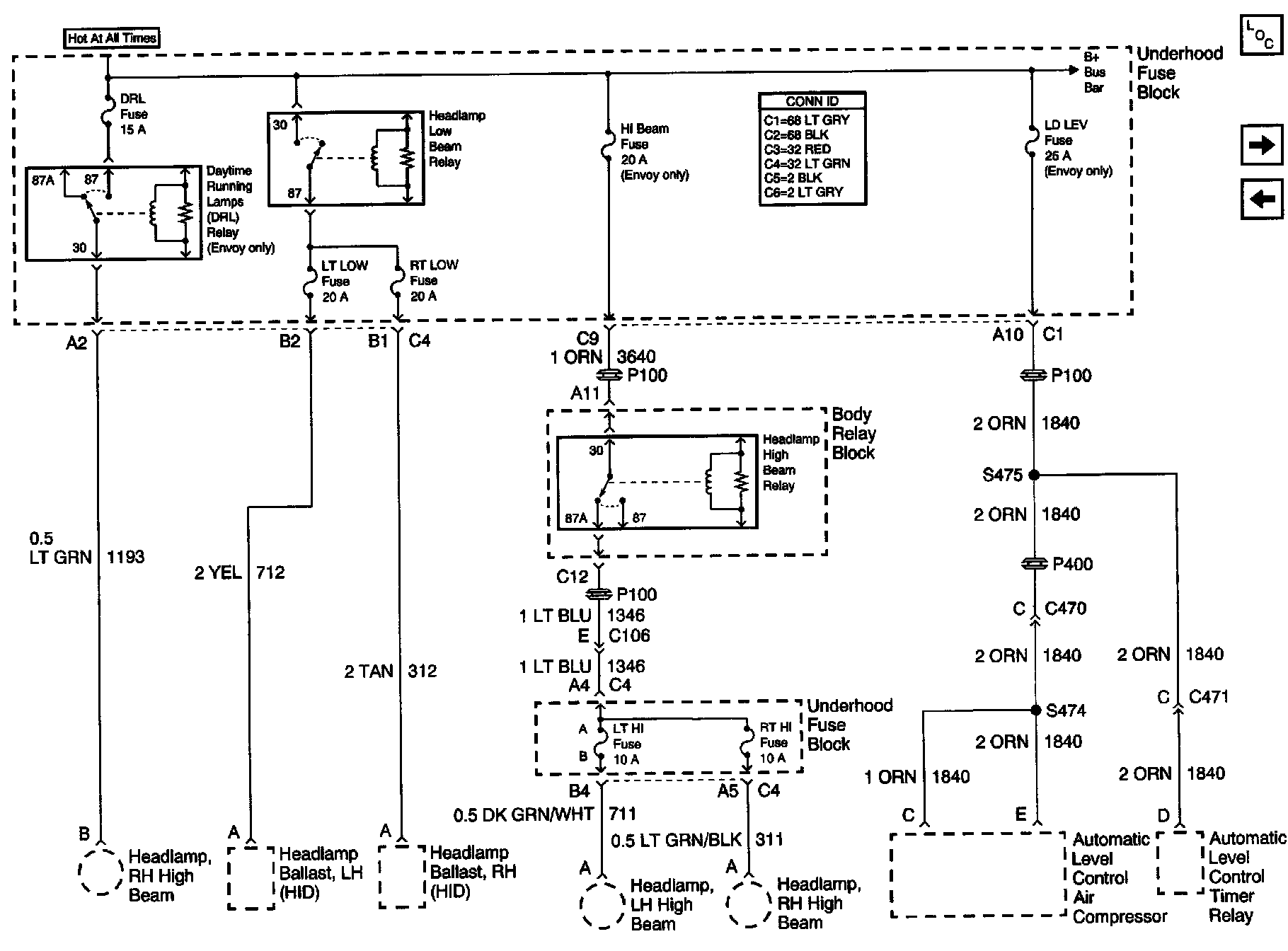 Power Distribution Schematics: HI BEAM, LD LEW, DRL Fuses And Low Beam Relay (Envoy Only):