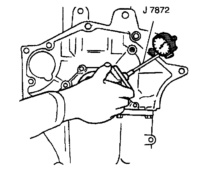 11.3. Place the J 7872 stem on the transmission mounting bolt hole boss. Set the J 7872 to 0.