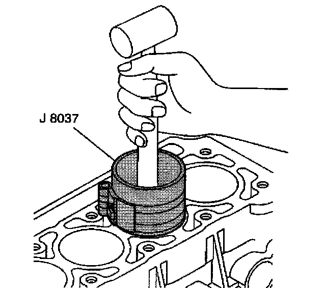 2.8. Hold the J 8037 against the engine block until all the rings have entered the cylinder bore.