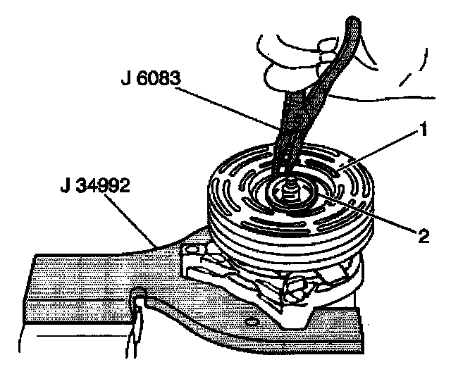 10. With the compressor mounted to the J 34992, position the pulley rotor (1) and bearing assembly on the front head.