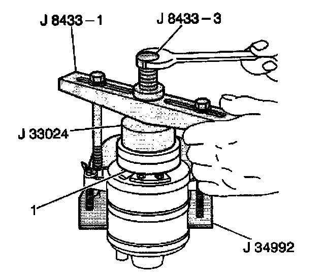 7. Turn the center forcing screw of the J 8433-1 in order to force the clutch coil onto the front head. Ensure that the clutch coil and the J 33024 remain aligned during installation.