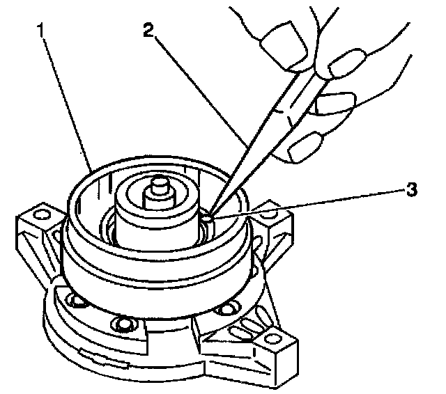 8. When the coil is fully seated on the front head, use a 1/8 inch diameter drift punch (2) in order to stake the front head at 3 places 120 degrees apart (3), in order to ensure that the clutch coil (1) remains in position.