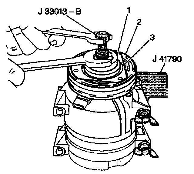5. Install the J 33013-B and bearing tools (1) onto the clutch plate (3) and the hub assembly (2).