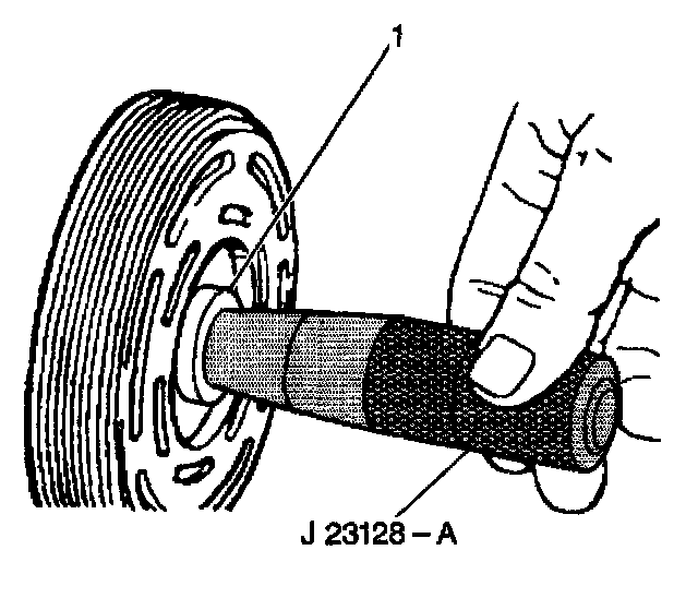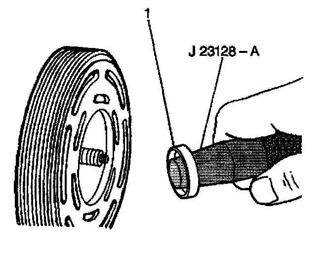 4. Fully engage the knurled tangs of the J 23128-A into the recessed portion of the seal (1) by turning the handle clockwise.