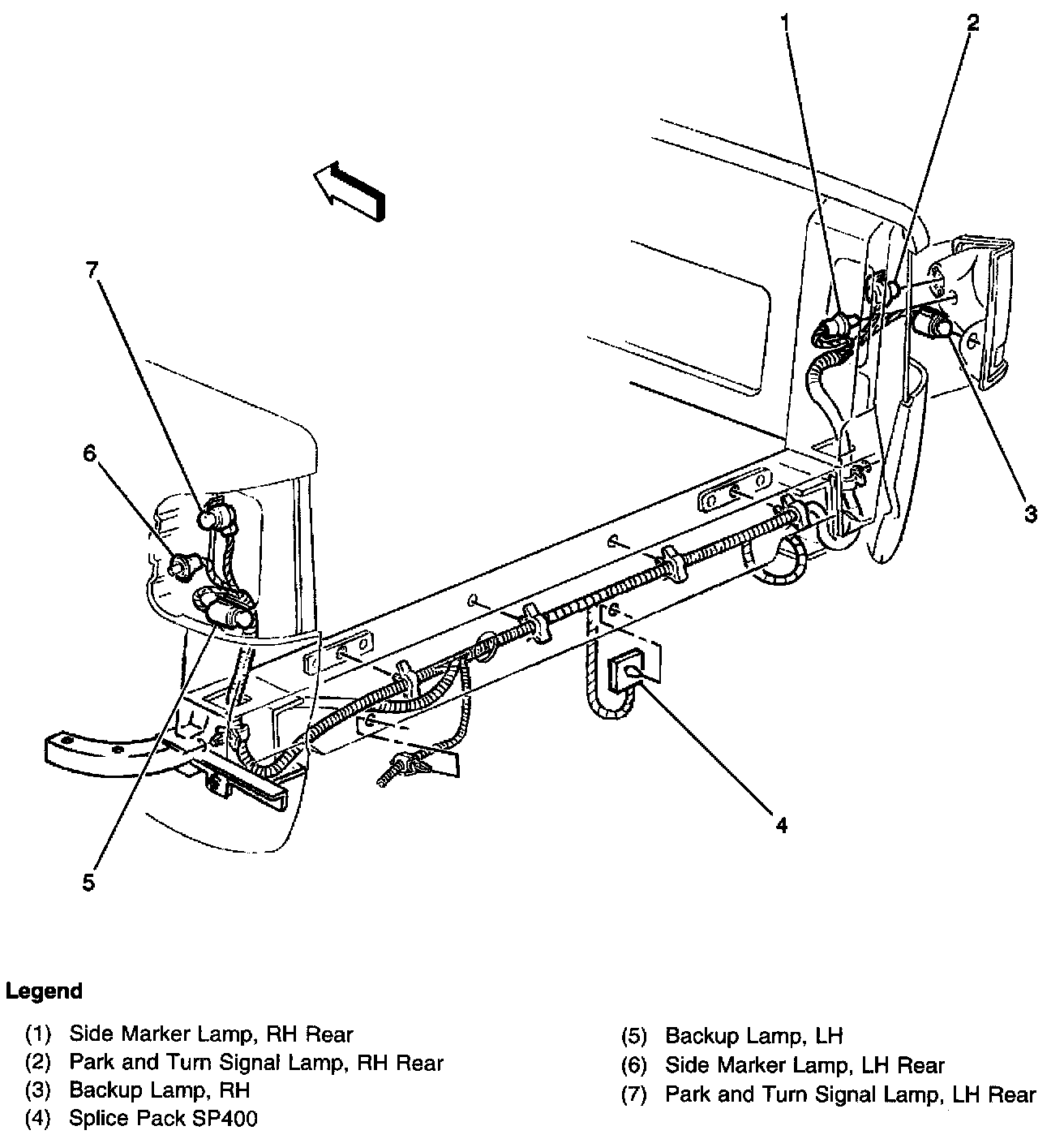 (CKT 1324, CKT 2509, CKT 2609) Tail lamp harness, on the center inside of the rear crossmember