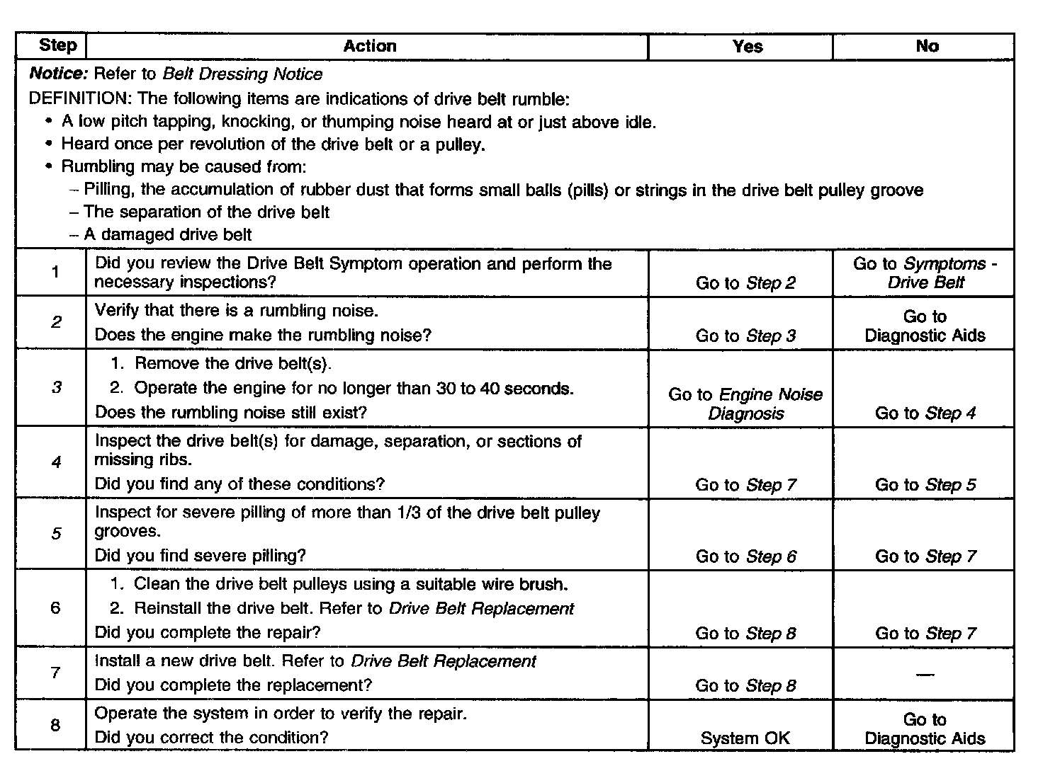 3. This test is to verify that the drive belt(s) is causing the rumbling noise. Rumbling noise may be confused with an internal engine noise due to the similarity in the description. Remove only one drive belt at a time if the vehicle has multiple drive belts. When removing the drive belt the water pump may not be operating and the engine may overheat. Also DTCs may set when the engine is operating with the drive belt removed.