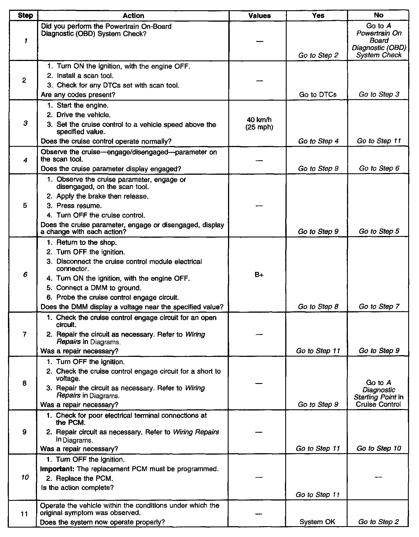^ This table will not diagnose any cruise control system circuits other than those connected to the PCM. For diagnosis of the remaining circuits, refer to Wiring Repairs in Diagrams.