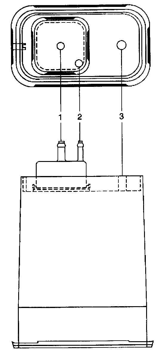 The EVAP canister, filled with charcoal pellets, stores the fuel vapors from the fuel tank. Vacuum is pulled from the fuel tank through the Vapor pipe (2). Fresh air (3) is mixed with the vapors and pulled to the intake manifold from the canister through the purge line (1). The engine vacuum purges the EVAP canister during normal driving.