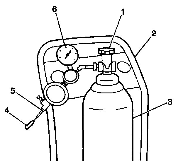 9. Disconnect the black hose (4) that connects the nitrogen cylinder to the EVAP pressure/purge diagnostic station J 41413 at the pressure regulator (5).