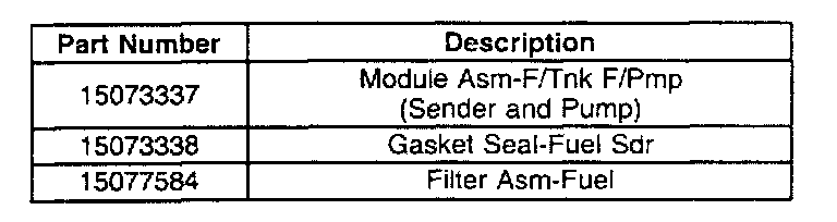 Replace the existing modular fuel sender assembly with a new assembly, P/N 15073337 and the existing fuel filter with a new filter, P/N 15077584. The new modular fuel sender assembly is equipped with a larger mesh strainer and the new fuel filter is designed to filter not only the fuel directed to the engine, but also the fuel being returned to the fuel tank. When replacing the modular fuel sender assembly, a new sender to tank seal, P/N 15073338, will also be required.