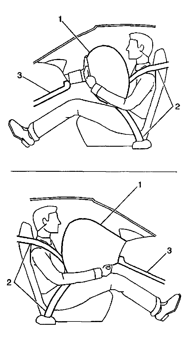 The frontal Supplemental Inflatable Restraint (SIR) system supplements the protection offered by the driver and front passenger seat belts. The frontal SIR system deploys an air bag (1) from the center of the steering wheel and from the right side of the instrument panel (1). The knee bolsters (3) absorb crash energy. The driver and passenger knee bolsters are below the instrument panel. The steering column is collapsible.