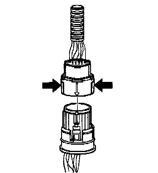 ^ In order to reinstall the external wiring connector, first orient the pins by lining up the arrows on each half of the connector. Push the connector straight down into the transmission without twisting or angling the mating parts.