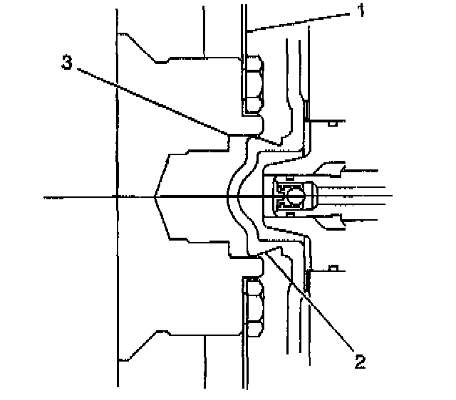 3. Align the torque converter hub (2) in the engine crankshaft (3) and install the torque converter to flywheel bolts. Refer to Flywheel to Torque Converter Bolts.