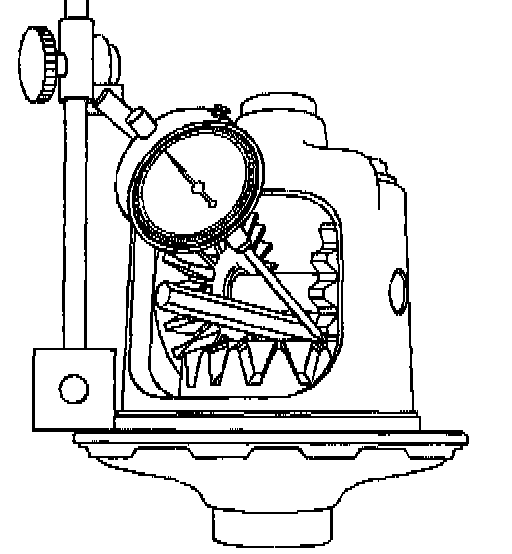 9. Mount and zero in a dial indicator to the ring gear flange. Place the stem of the indicator on one of the teeth of the pinion gear closest to the lock screw.