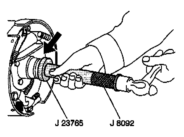 52. Install the bearing using the J23765 and the J8092 until the tool bottoms out against the housing shoulder. Lubricate the bearing using axle lubricant.