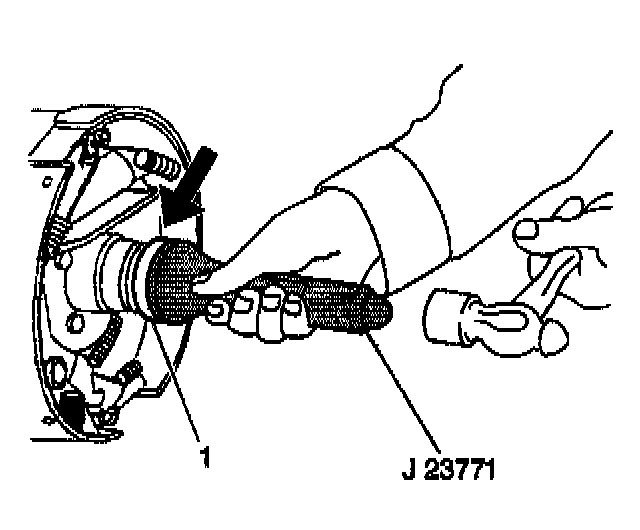 53. Install the oil seal (1) using the J23771 until the seal (1) is flush with the axle tube. Lubricate the seal lips using axle lubricant.
