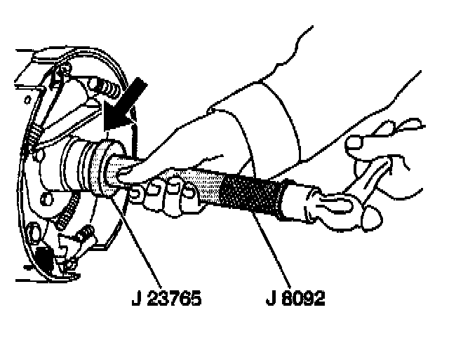 1. Install the bearing using the J23765 until the tool bottoms against the housing shoulder.