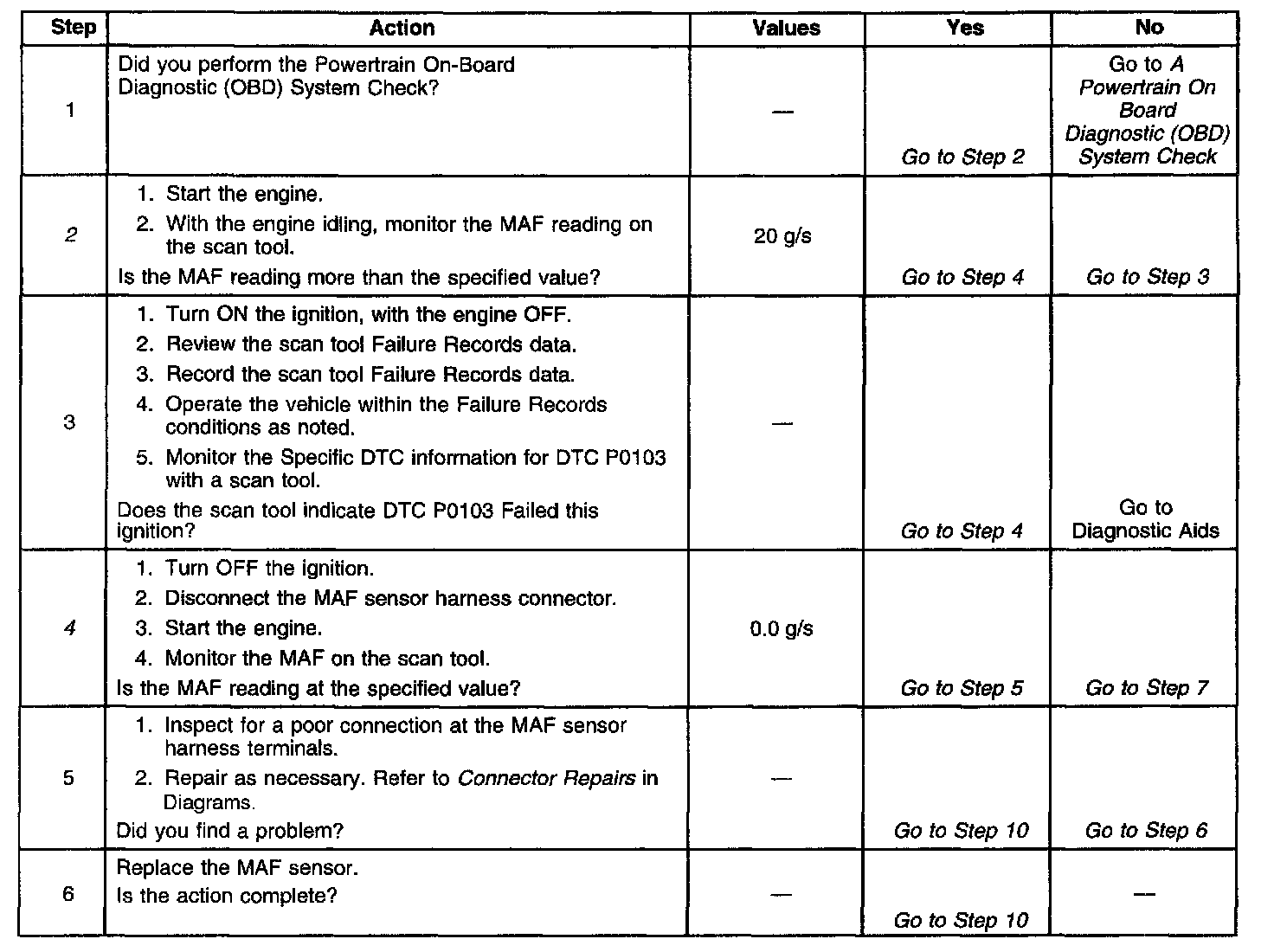^ A damaged harness - Inspect the wiring harness for damage. If the harness appears to be OK, observe the scan tool while moving connectors and wiring harnesses related to the MAF sensor. A change in the display will indicate the location of the malfunction.