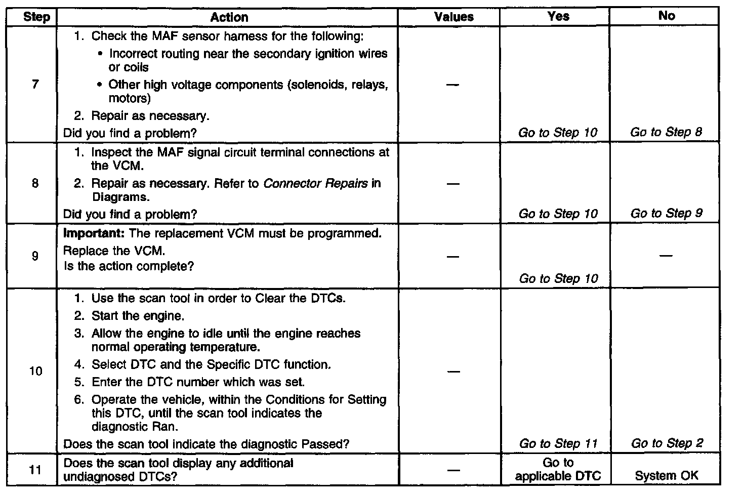 This DTC is designed to detect an unusually high MAF sensor signal frequency. If the VCM detects a MAF signal frequency above the possible range of a normally operating MAF sensor, this DTC will be set.
