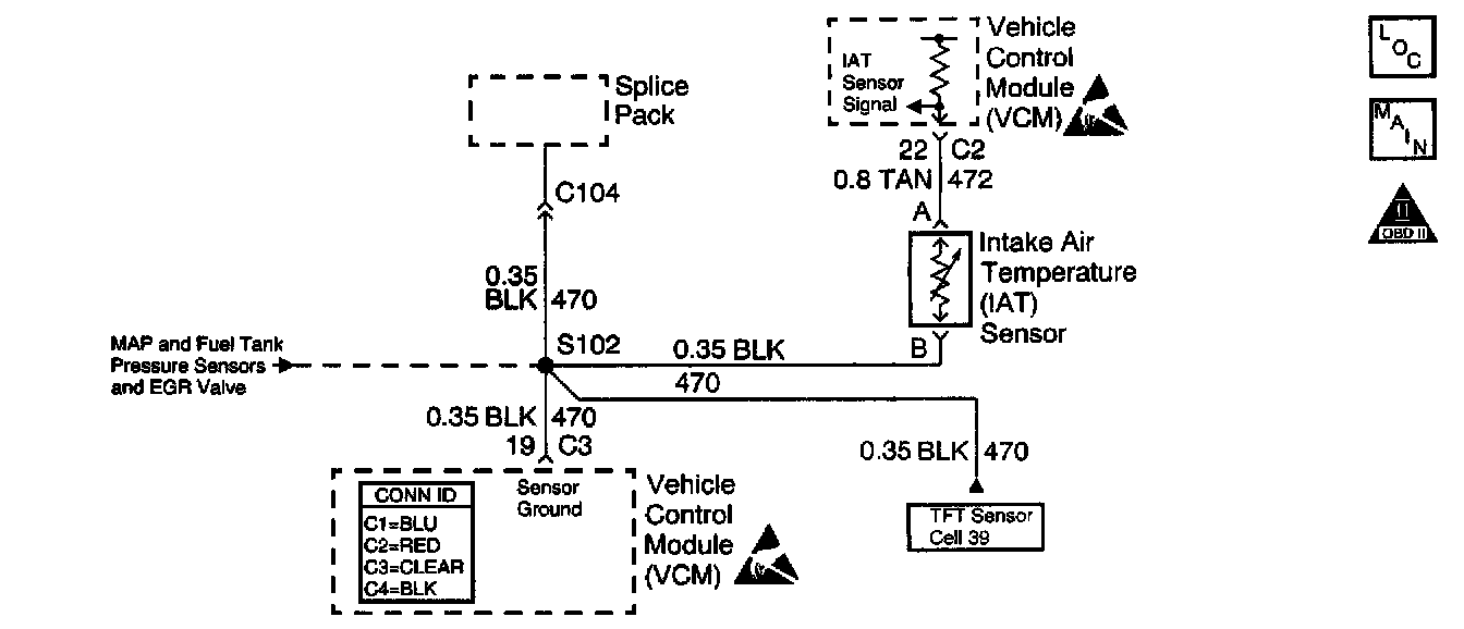 The Intake Air Temperature (IAT) sensor is a thermistor. The control module supplies the IAT sensor a reference voltage on the IAT sensor signal circuit and a ground circuit. When the IAT sensor resistance is high, indicating a cold sensor, the IAT sensor signal voltage remains near the supplied voltage and decreases the signal voltage as the sensor warms. The control module monitors the IAT sensor signal circuit in order to calculate the temperature of the air entering the engine.
