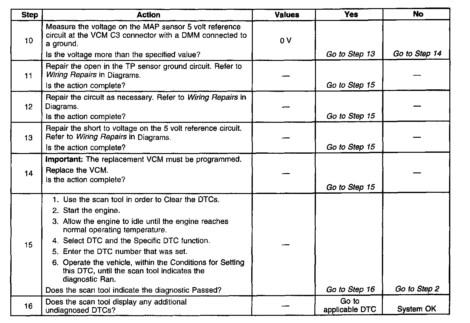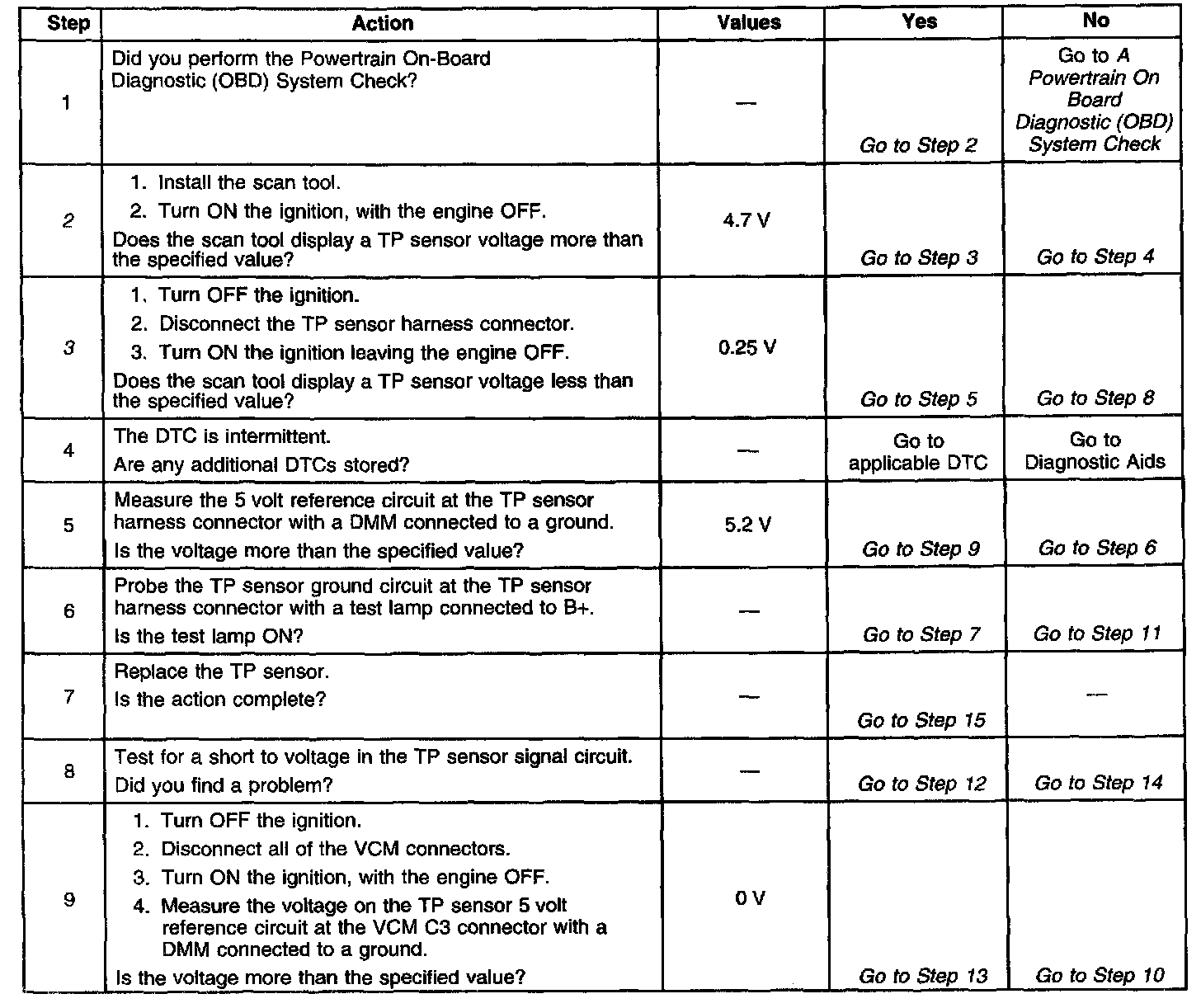 3. With the TP sensor disconnected, and if the VCM and the wiring are okay, the TP signal should go below 0.25 volt. This test could set a DTC P0122.