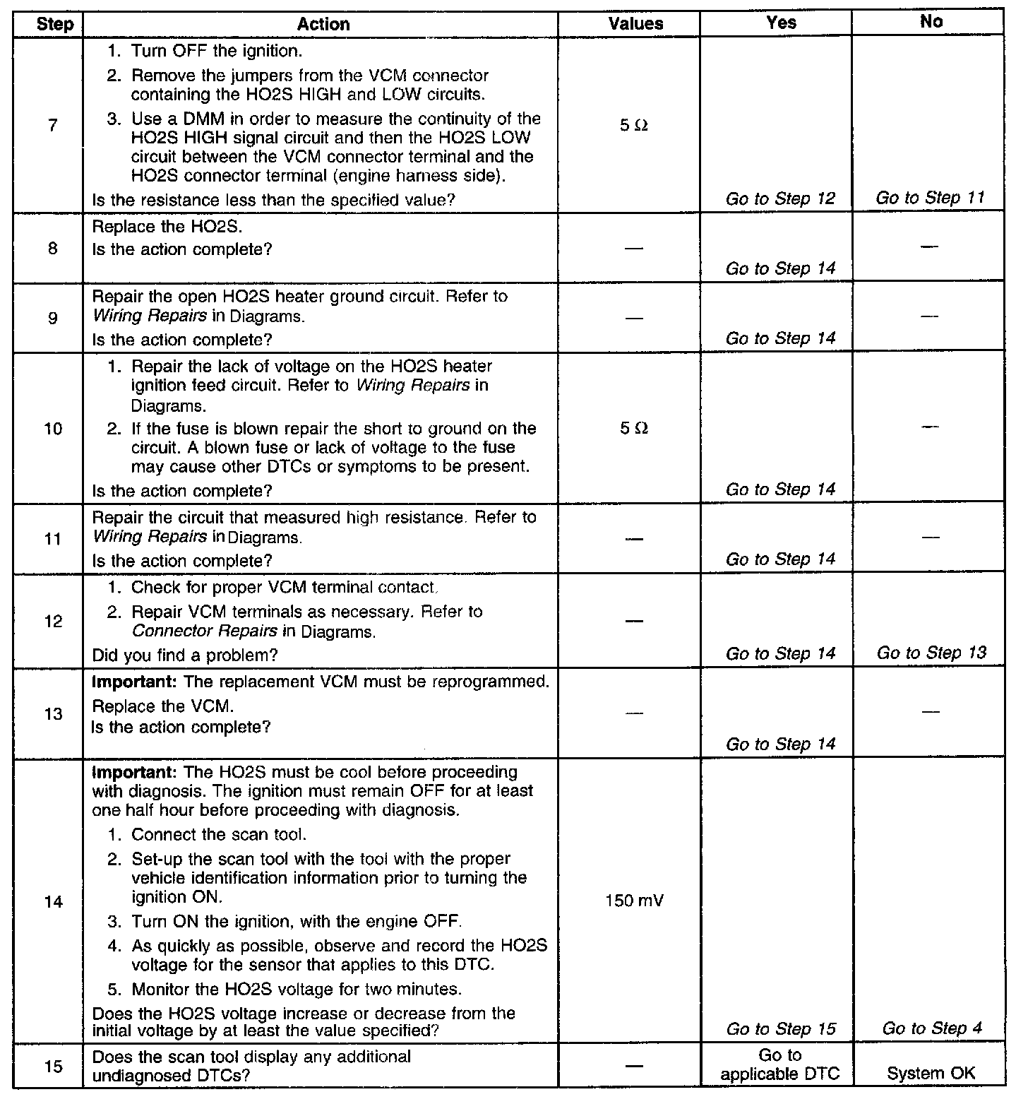 The numbers below refer to the step numbers on the diagnostic table.