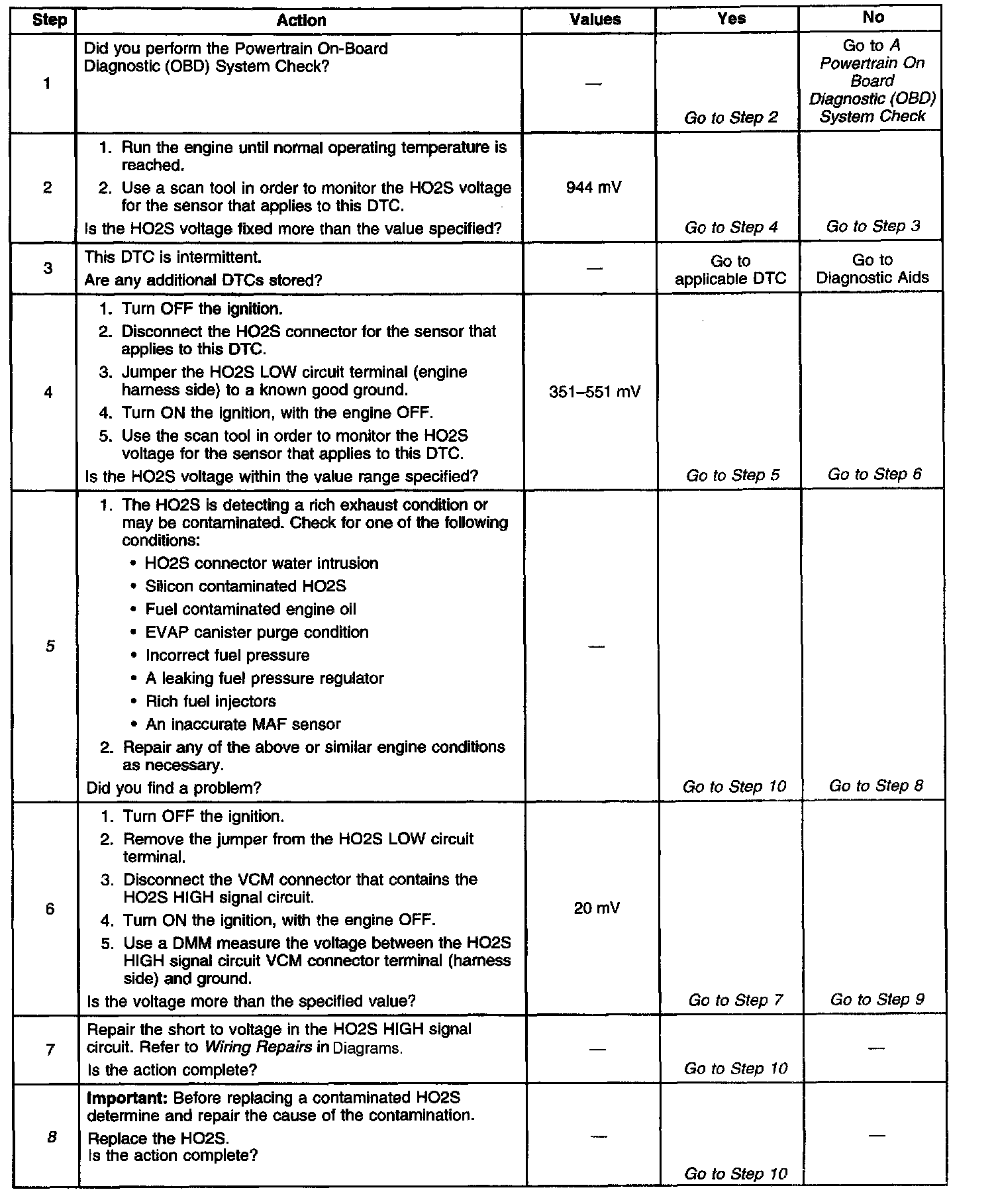 This DTC is designed to detect an HO2S voltage that remains at a high (rich) voltage for more than a specified number of seconds during the test conditions. This DTC is set under the following conditions: