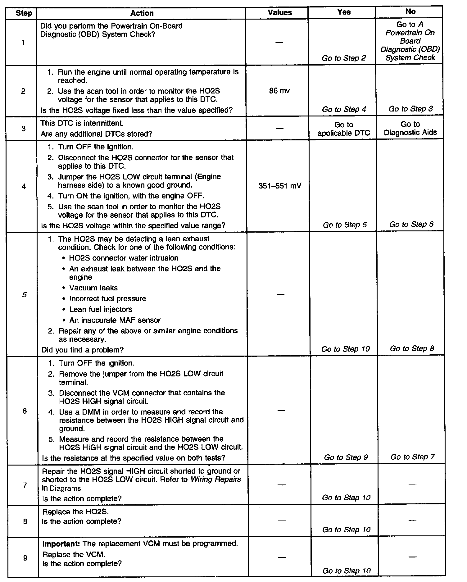 This DTC is designed to detect an HO2S voltage that remains at a low (lean) voltage for more than a specified number of seconds during the test conditions. This DTC is set under the following conditions: