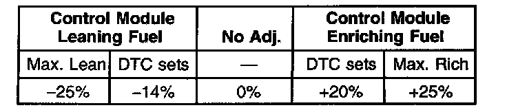 The fuel trim values table indicates the typical fuel adjustment values as displayed on a scan tool. Negative values, or a rich condition, indicates that the injector pulse width is being decreased in order to lean out the fuel mixture. Positive values, or a lean condition, indicates that the injector pulse width is being increased in order to richen the fuel mixture.