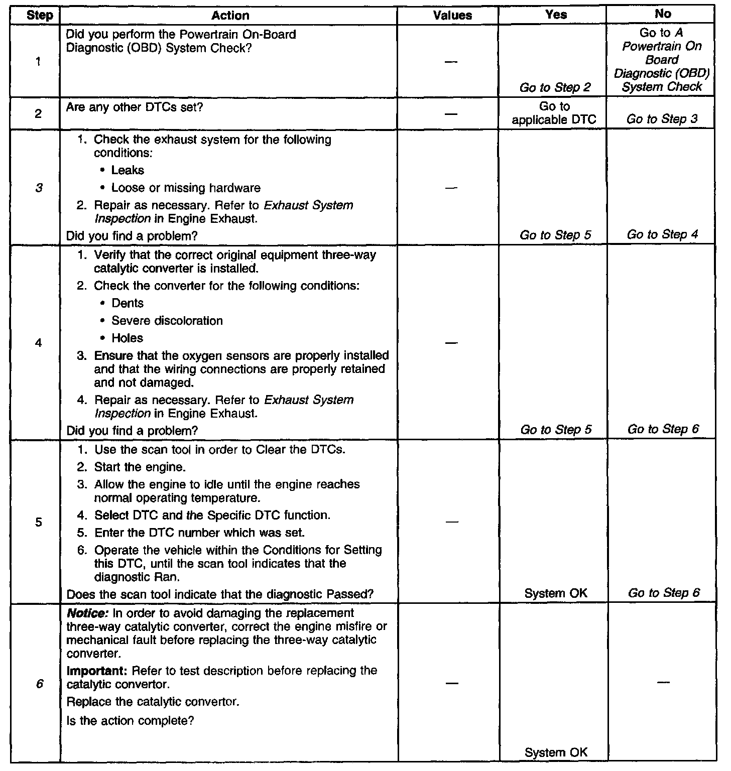 3. This table checks for conditions that can cause the three-way catalytic converter efficiency to appear degraded. Inspect and repair the exhaust system as necessary.