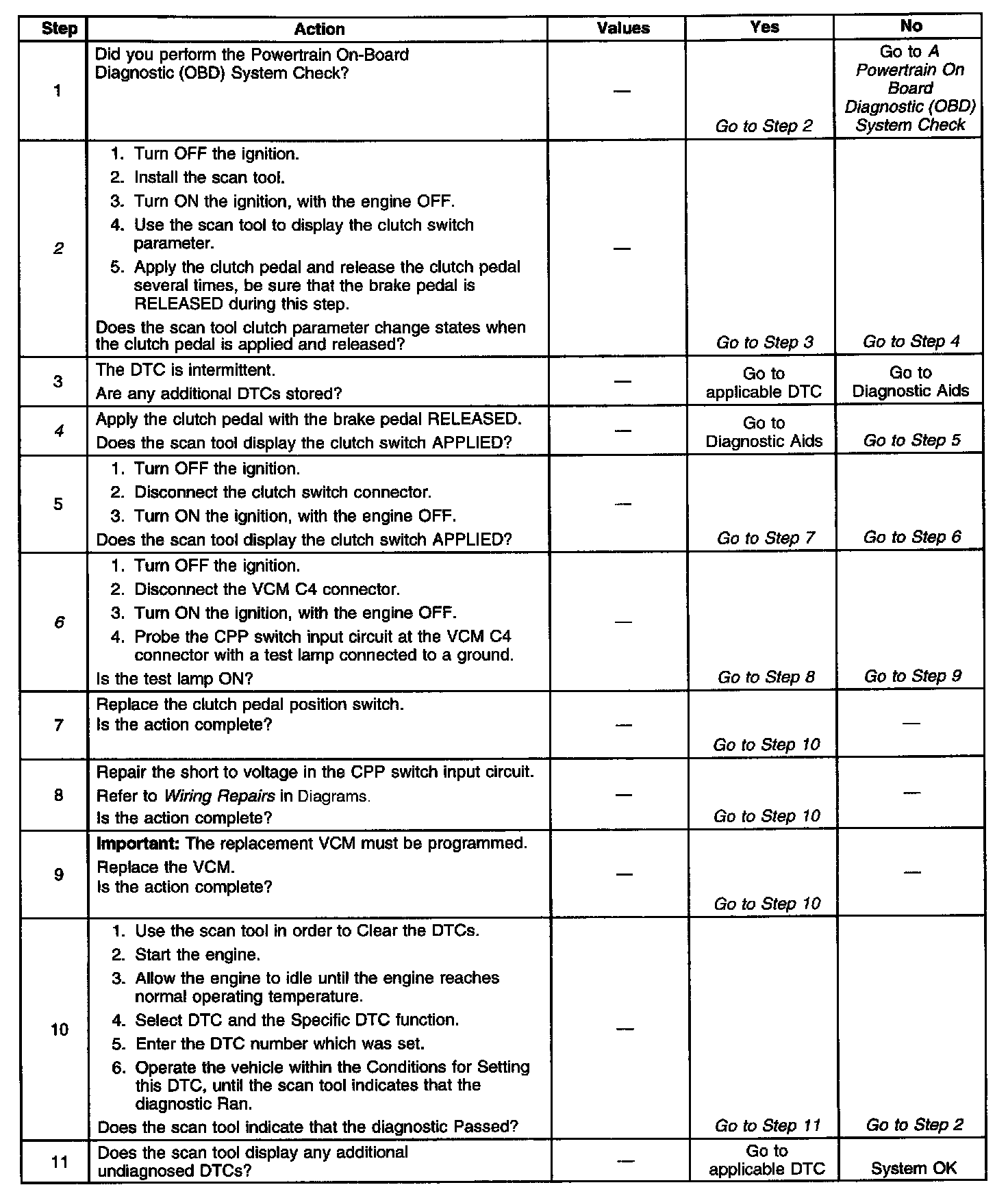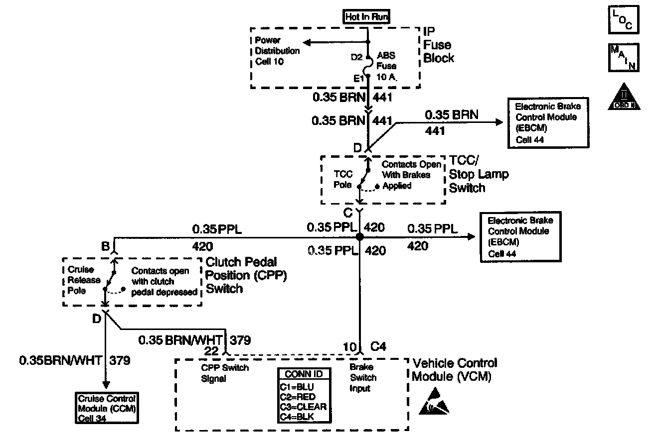 The Clutch Pedal Position (CPP) Switch is used to determine when the clutch pedal is applied. Ignition voltage is applied to the control module (PCM/VCM) CPP input through the CPP switch. When the clutch pedal is depressed, ignition voltage is removed from this input. The control module monitors the CPP signal for transitions during normal vehicle operations. If the control module detects that no clutch pedal applications have occurred during a predetermined test cycle, a DTC P0704 will be set.