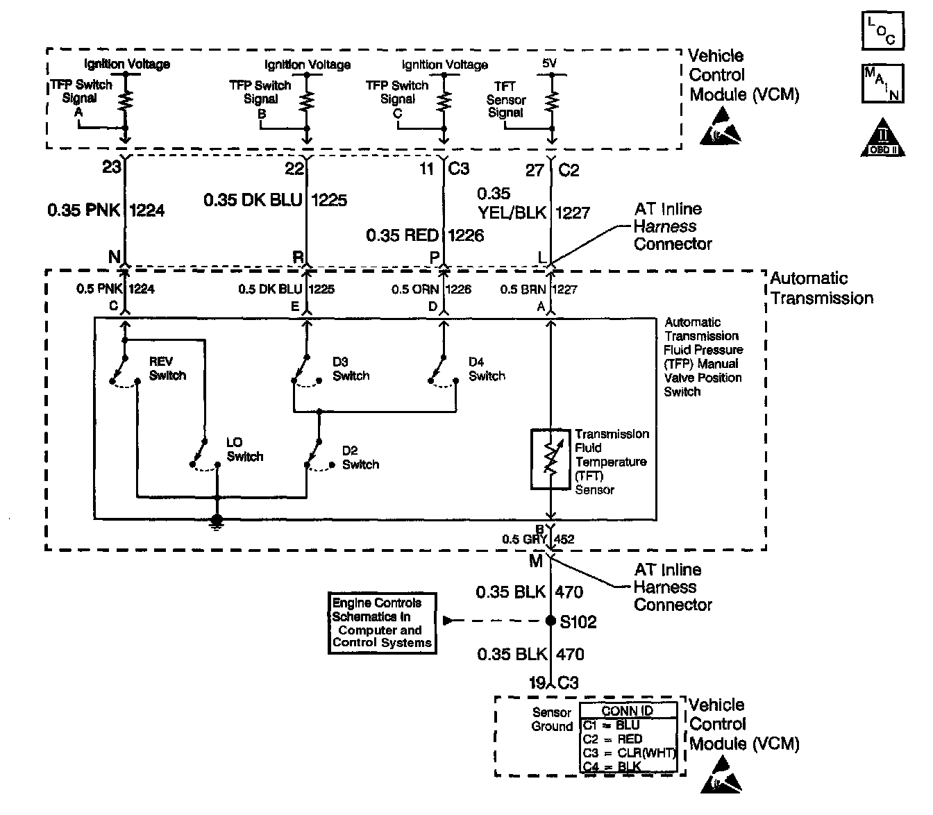The automatic Transmission Fluid Temperature (TFT) sensor is part of the automatic Transmission Fluid Pressure (TFP) manual valve position switch. The TFT sensor is a resistor, or thermistor, which changes value based on temperature. The sensor has a negative-temperature coefficient. This means that as the temperature increases, the resistance decreases, and as the temperature decreases, the resistance increases. The Vehicle Control Module (VCM) supplies a 5-Volt reference signal to the sensor on circuit 1227 and measures the voltage drop in the circuit. When the transmission fluid is cold, the sensor resistance is high and the VCM detects high signal voltage. As the fluid temperature warms to a normal operating temperature, the resistance becomes less and the signal voltage decreases. The VCM uses this information to control shift quality and torque convener clutch apply.