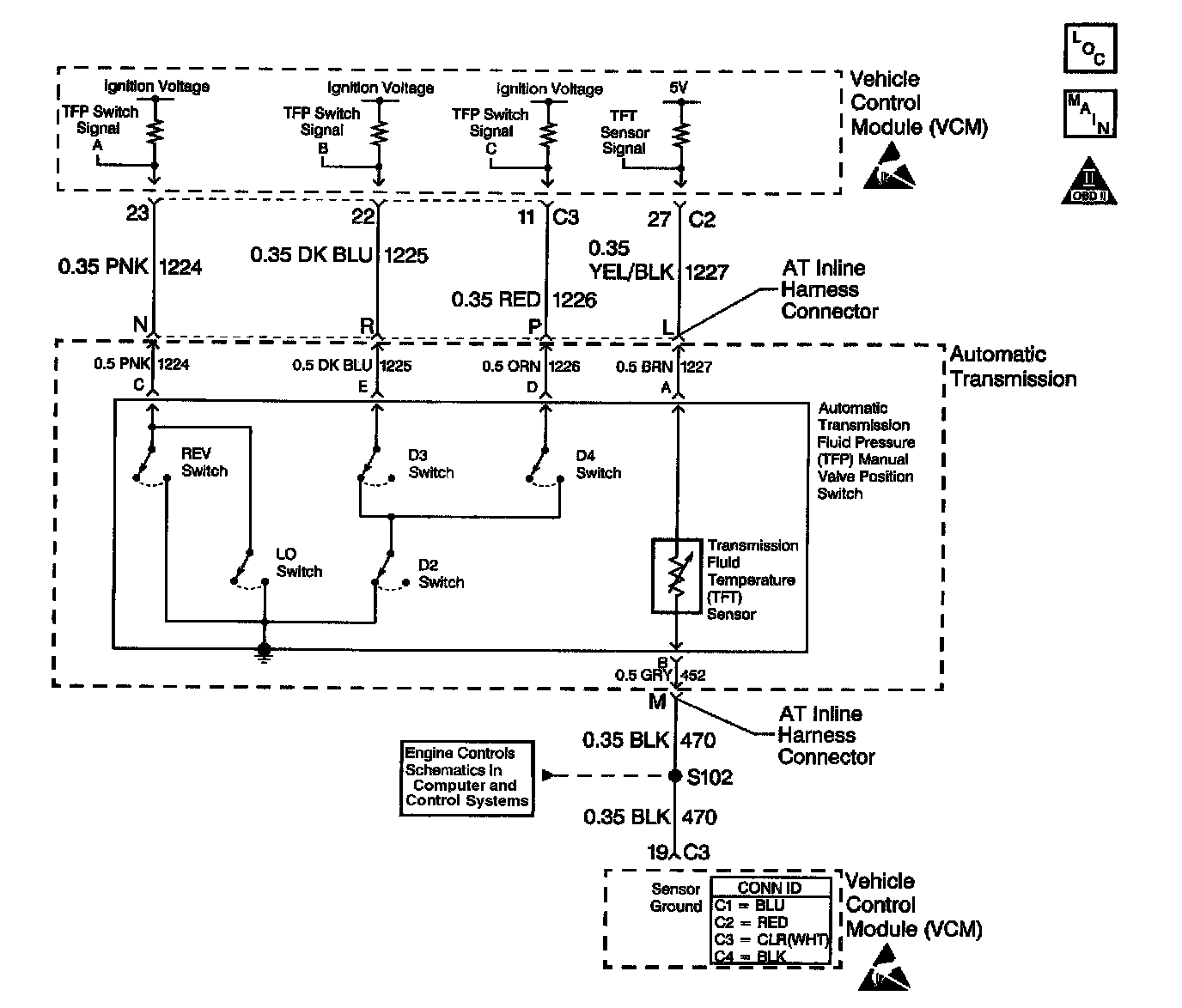 The automatic Transmission Fluid Temperature (TFT) sensor is part of the automatic Transmission Fluid Pressure (TFP) manual valve position switch. The TFT sensor is a resistor, or thermistor, which changes value based on temperature. The sensor has a negative-temperature coefficient. This means that as the temperature increases, the resistance decreases, and as the temperature decreases, the resistance increases. The Vehicle Control Module (VCM) supplies a 5-Volt reference signal to the sensor on circuit 1227 and measures the voltage drop in the circuit. When the transmission fluid is cold, the sensor resistance is high and the VCM detects high signal voltage. As the fluid temperature warms to a normal operating temperature, the resistance becomes less and the signal voltage decreases. The VCM uses this information to control shift quality and torque converter clutch apply.