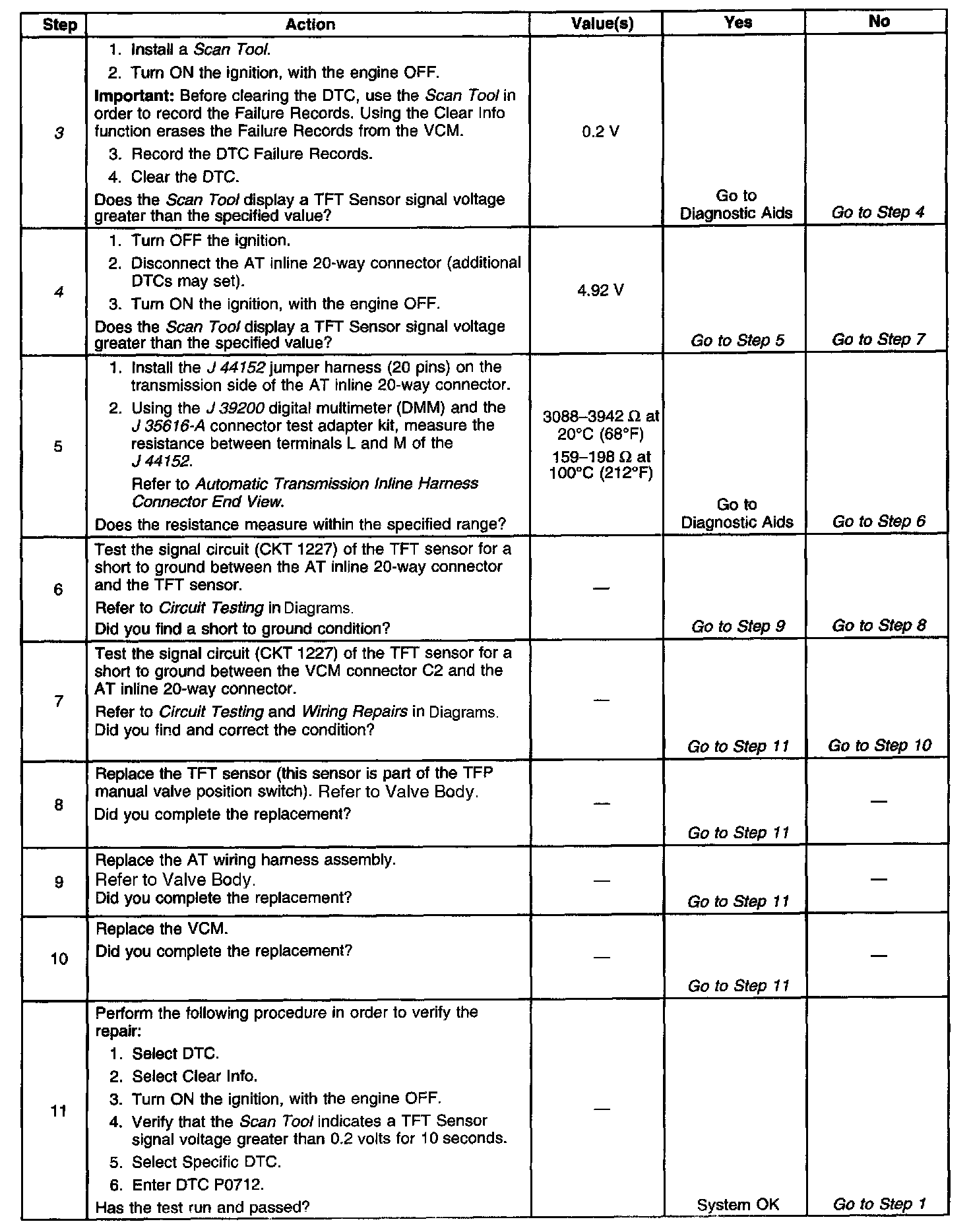 When the VCM detects a continuous short to ground in the TFT signal circuit or in the TFT sensor, then DTC P0712 sets. DTC P0712 is a type C DTC.