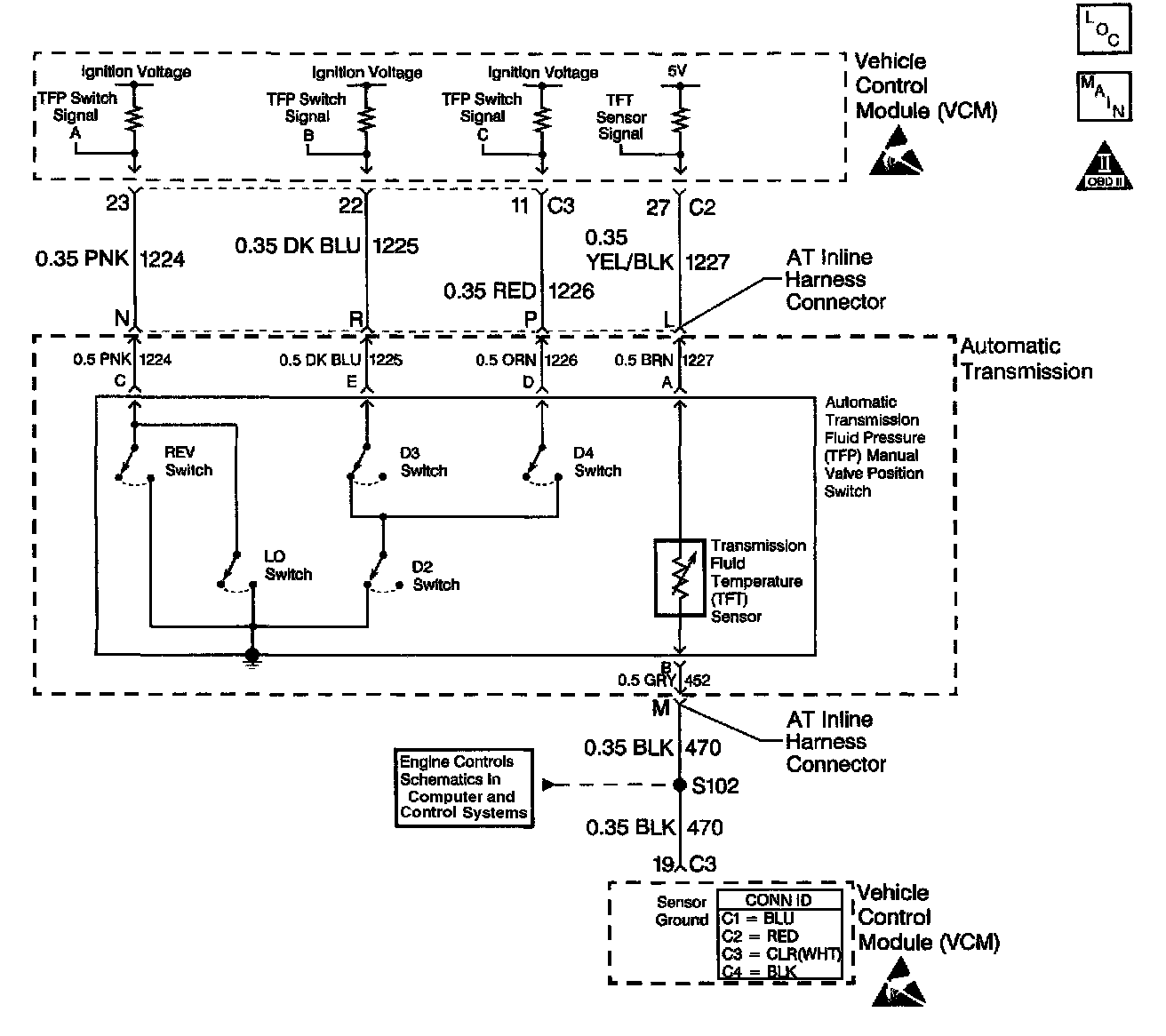 The automatic Transmission Fluid Temperature (TFT) sensor is pan of the automatic Transmission Fluid Pressure (TFP) manual valve position switch. The TFT sensor is a resistor, or thermistor, which changes value based on temperature. The sensor has a negative-temperature coefficient. This means that as the temperature increases, the resistance decreases, and as the temperature decreases, the resistance increases. The Vehicle Control Module (VCM) supplies a 5-Volt reference signal to the sensor on circuit 1227 and measures the voltage drop in the circuit. When the transmission fluid is cold, the sensor resistance is high and the VCM detects high signal voltage. As the fluid temperature warms to a normal operating temperature, the resistance becomes less and the signal voltage decreases. The VCM uses this information to control shift quality and torque converter clutch apply.