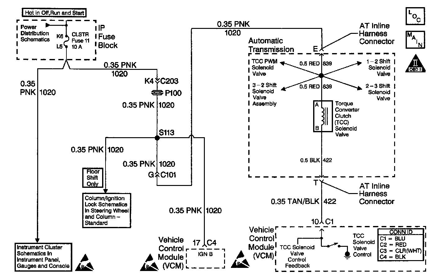 The Torque Converter Clutch (TCC) solenoid valve is an electrical device that is used with the Torque Converter Clutch Pulse Width Modulation (TCC PWM) solenoid valve in order to control TCC apply and release. The TCC solenoid valve attaches to the transmission case assembly extending into the pump cover. The TCC solenoid valve receives ignition voltage through circuit 1020. The Vehicle Control Module (VCM) controls the solenoid by providing the ground path on circuit 422. The VCM monitors the Throttle Position (TP) voltage, the vehicle speed, and other inputs in order to determine when to energize the TCC solenoid valve.