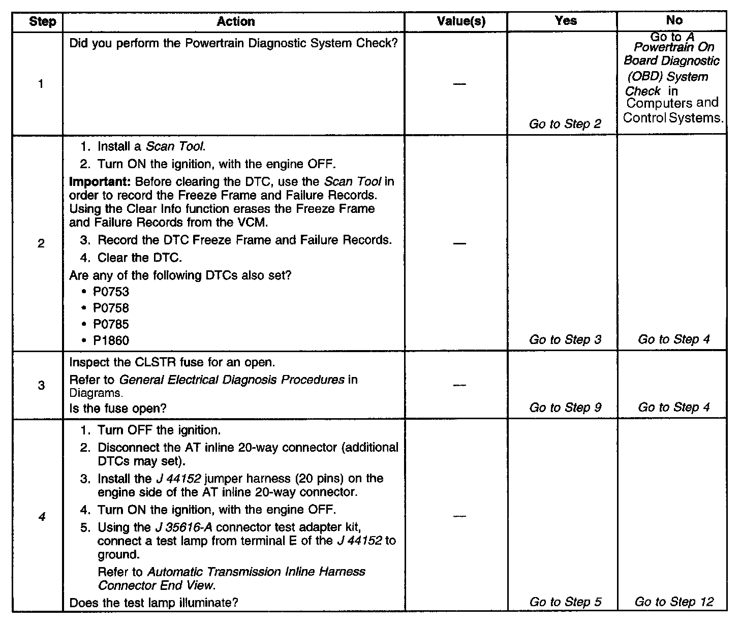 The numbers below refer to the step numbers on the diagnostic table.