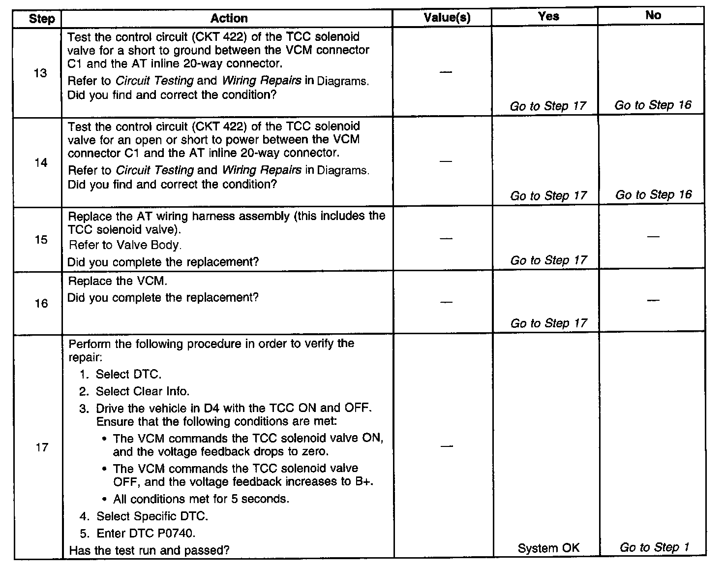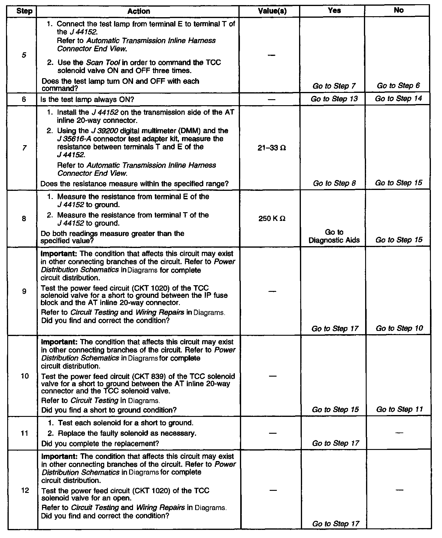 7. This step tests the resistance of the TCC solenoid valve and the Automatic Transmission (AT) wiring harness assembly.
