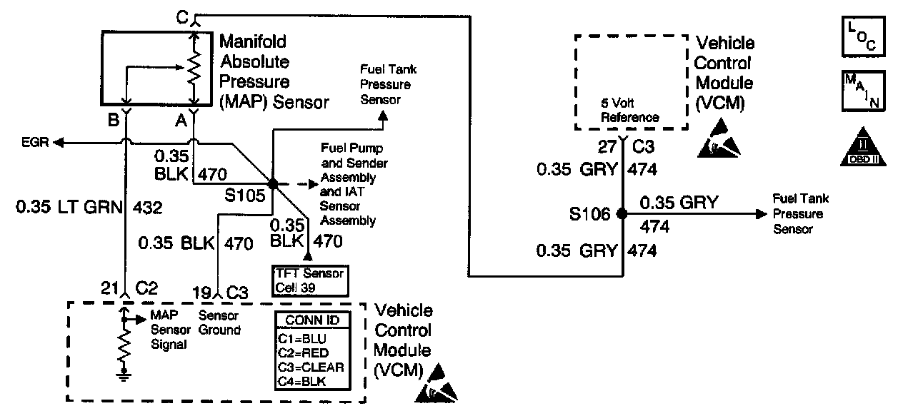 The Manifold Absolute Pressure (MAP) sensor is a pressure sensor. The control module supplies the MAP sensor a reference voltage, signal, and ground circuits. When manifold vacuum is low, the MAP sensor signal voltage rises to a value near the reference voltage, and the MAP sensor signal voltage decreases when the manifold vacuum increases. The control module monitors the MAP sensor signal circuit voltage in order to calculate the vacuum within the intake manifold.