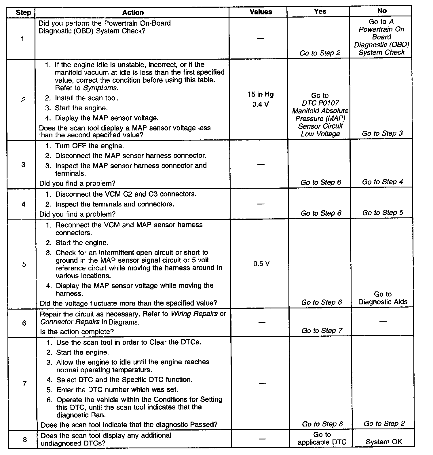 2. If the MAP sensor voltage is less than 0.4 volts then the condition is present. Even though DTC P0107 did not set, the P0107 is more comprehensive and may aid in diagnosis.